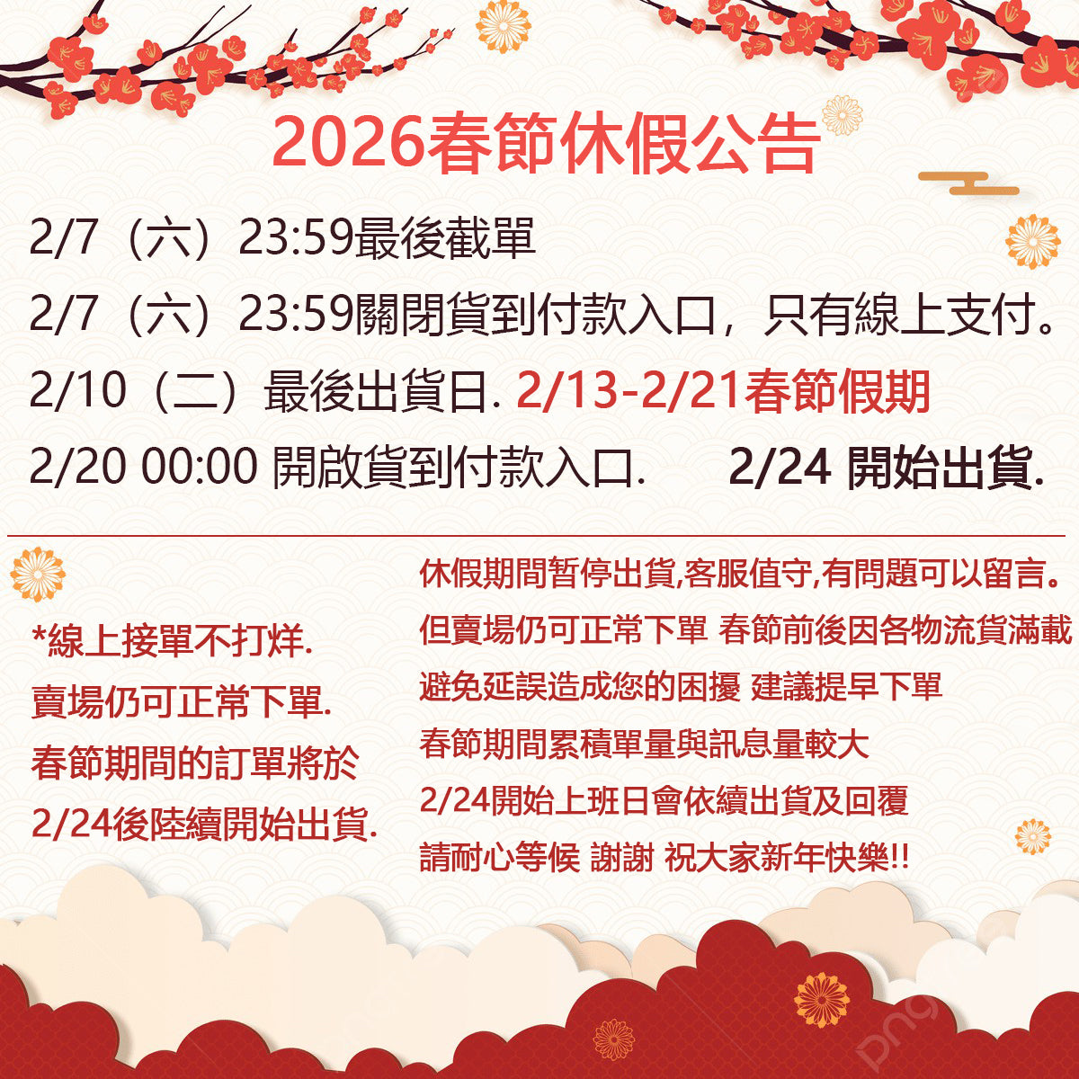 2/10(二)最後出貨日 2/13(五)-2/21(六).