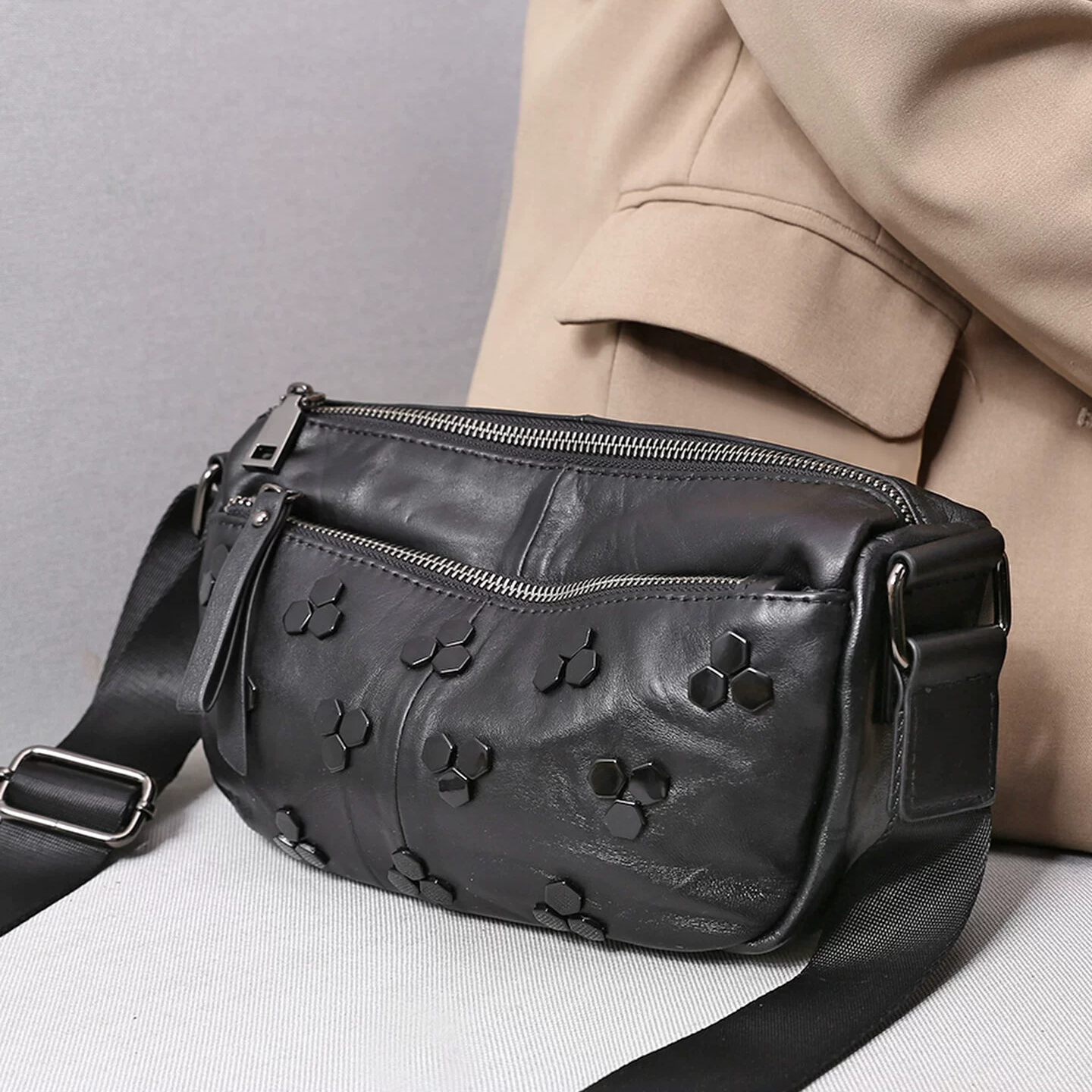 李記 | 原創手工真皮 | 寬肩帶の鉚釘枕頭包n1133號