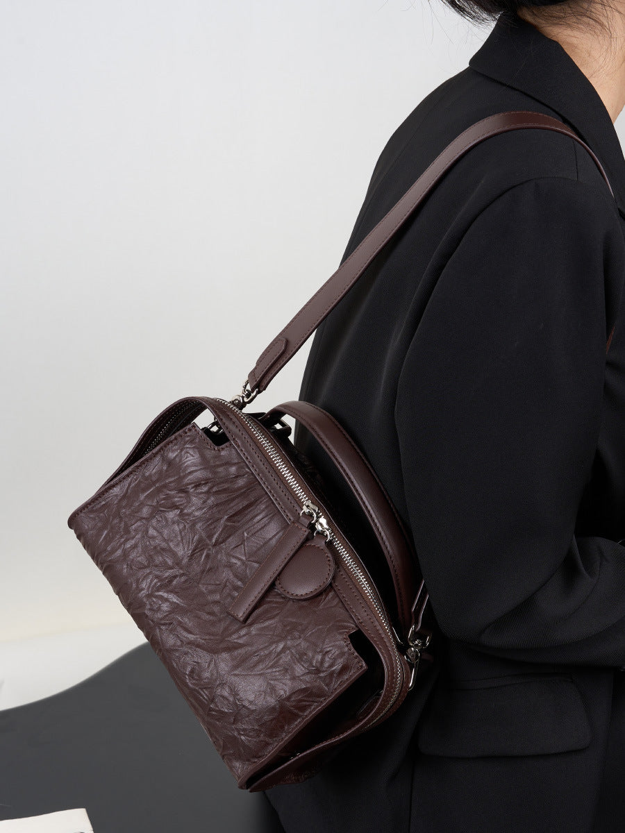 特色牛皮紙效果頭層牛皮,個性時髦的頭層牛皮面料,呈現出褶皺的牛皮紙效果,讓人眼前一亮特別有味道。 特別的褶皺效果搭配個性的造型,你一定會愛上這款背包