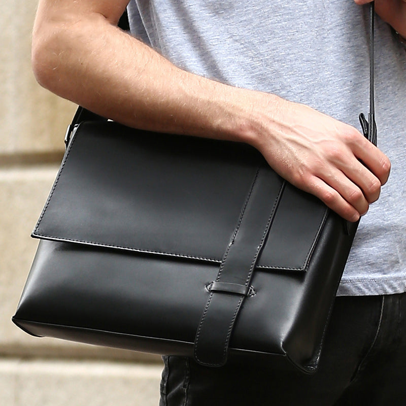 和風日式款,機車款,頭層牛皮,純色中偏軟橫款方型,包蓋式開蓋,單根肩帶根數,軟面加工,伸縮式提把提拎部件,裡料滌棉質地內貼袋,耐磨耐用;