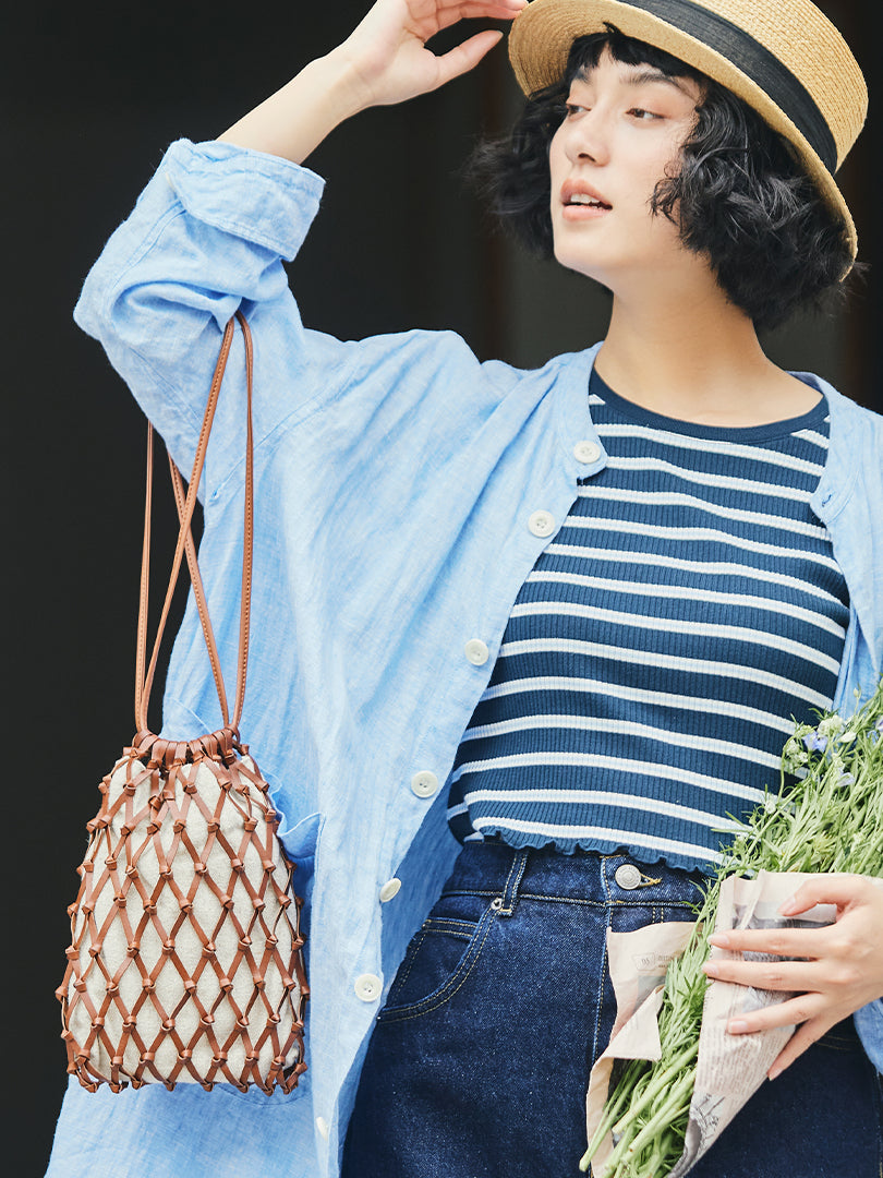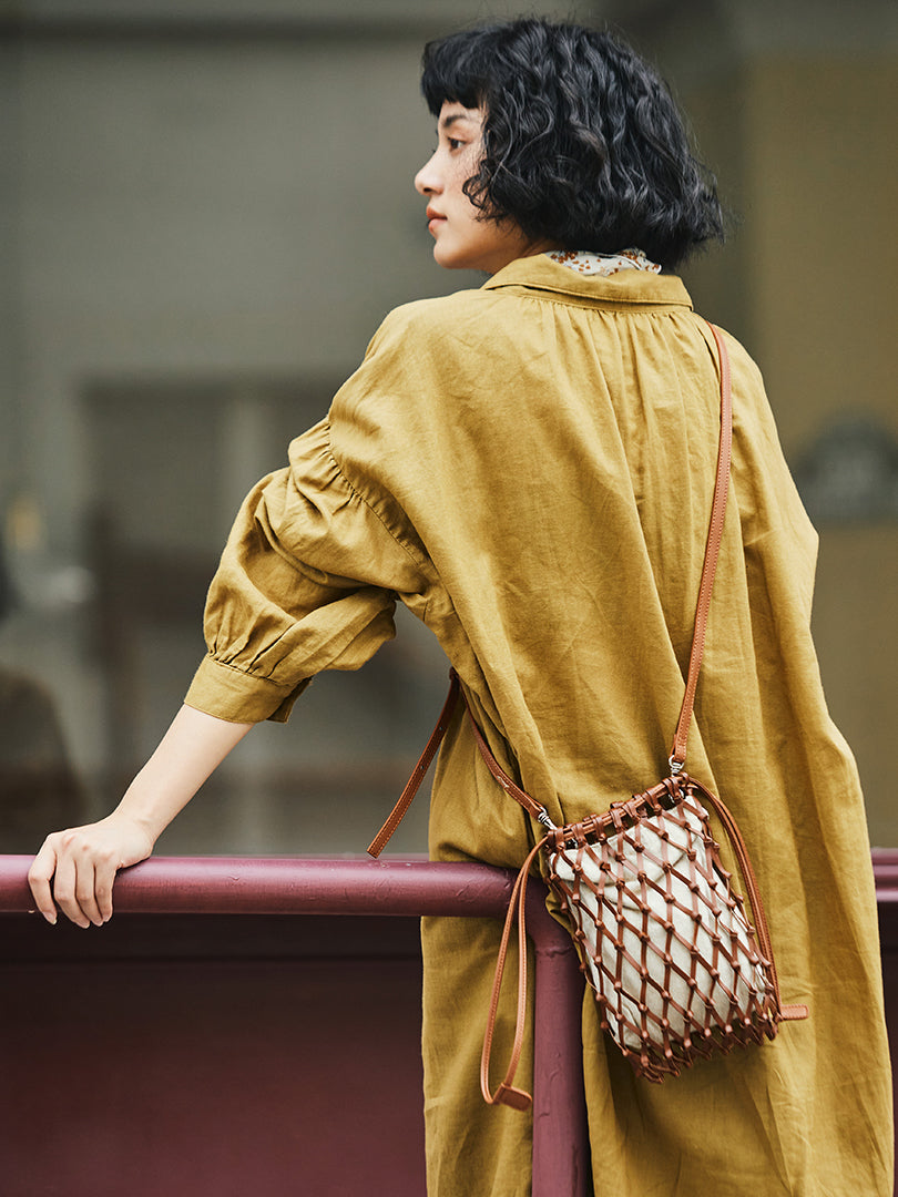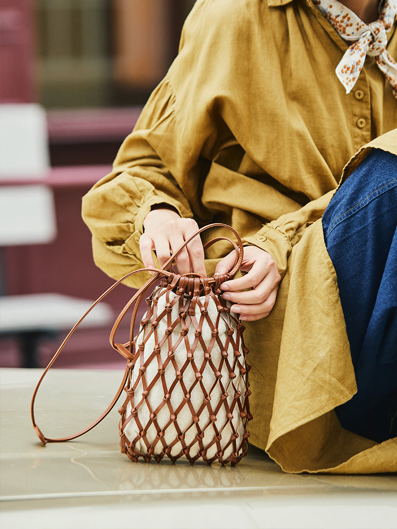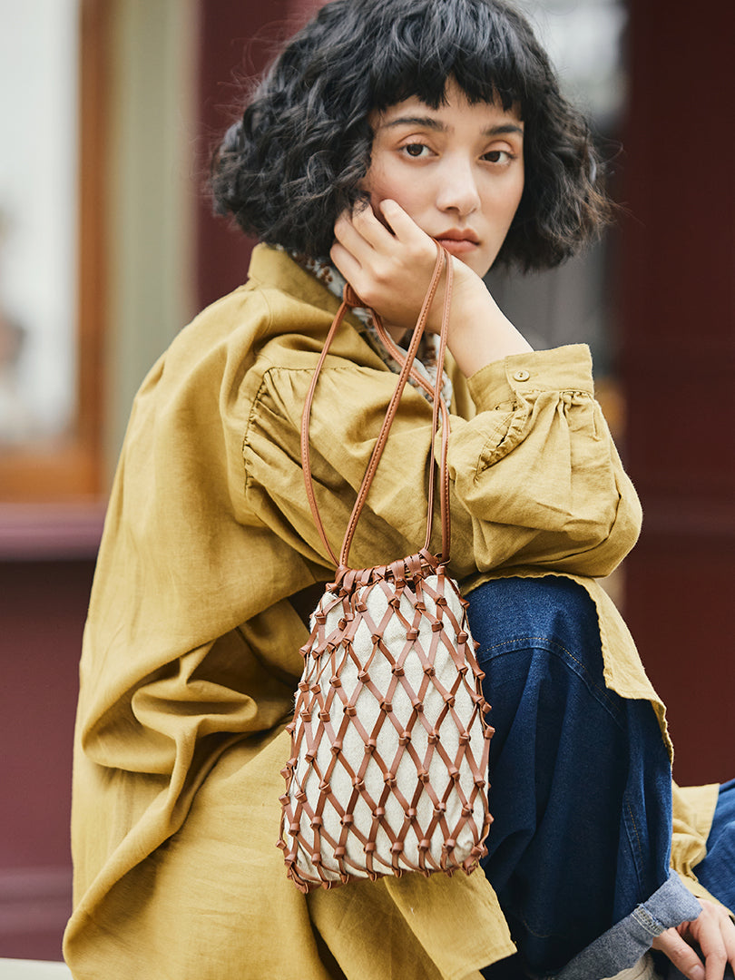Li Ji |. หนังแท้ทำมือดั้งเดิม |. กระเป๋าใบเล็กทรงเรขาคณิตถักด้วยมือ グ縦.