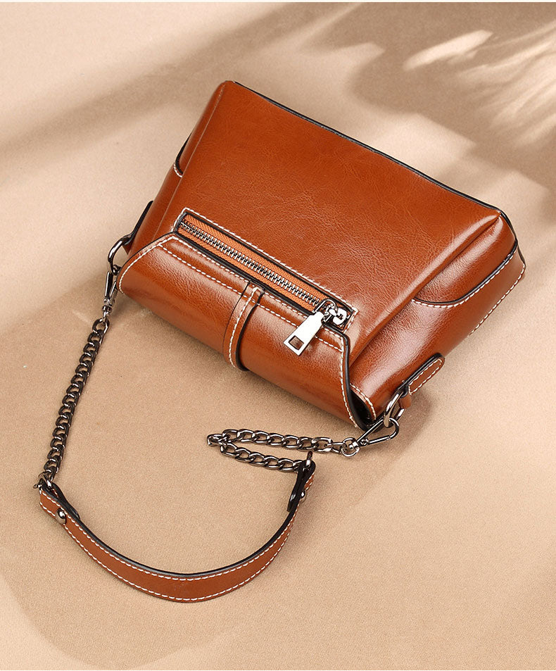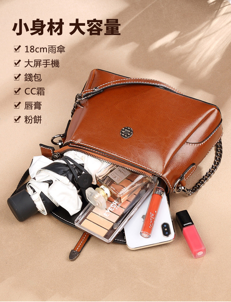 單肩/斜跨,皮質是油蠟牛皮(耐髒耐舊,方便打理),淨重約:0.48KG,尺寸:長21.5CM*高13.5CM*厚7CM,結構有2個主容量,1拉鍊隔袋,1拉鍊內袋,1內袋,1拉鍊背袋,可裝18cm傘+錢包+大屏手機+cc霜等日常用品~