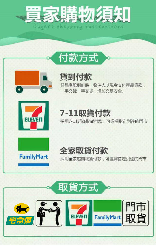 台灣 貨到付款默認選擇 黑貓宅急便。超商取貨有7-11或者全家可以選擇,超商取貨的,請備註門市名字,所有業配,目前皆免郵費。如有問題可以聯繫Facebook主頁。