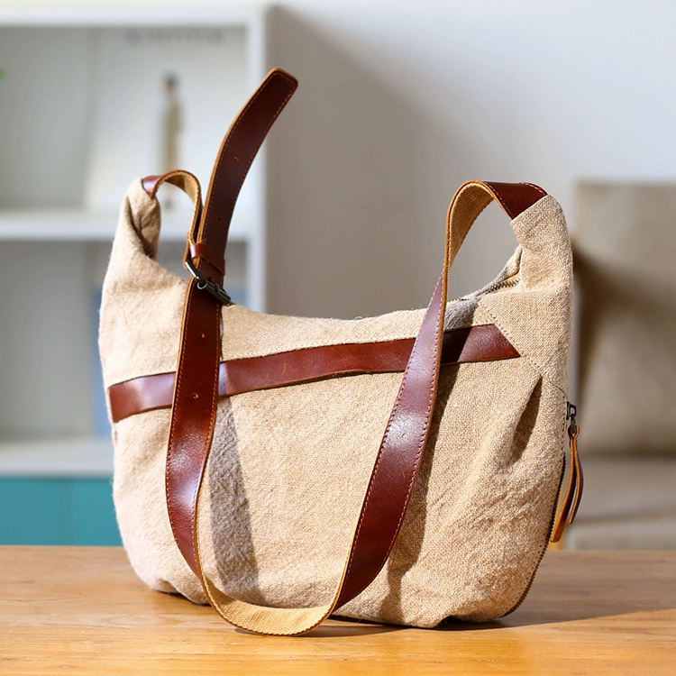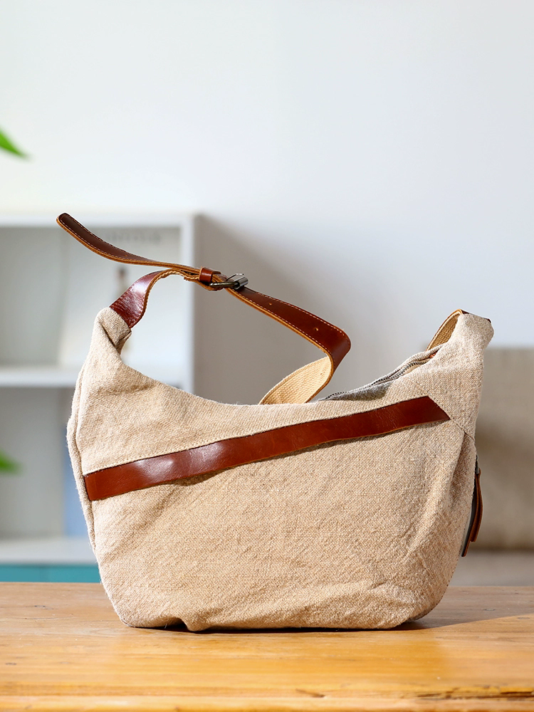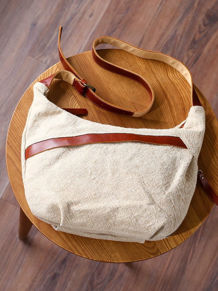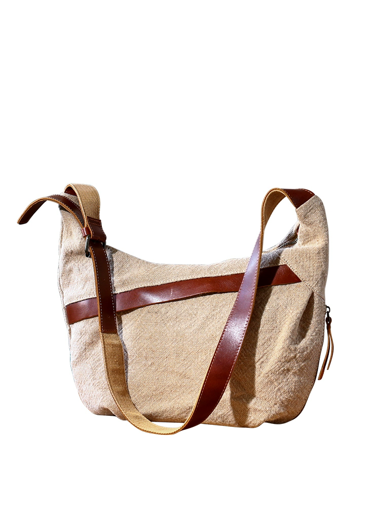 文藝系棉麻單肩包,瘋馬皮+優質棉麻布料,容量比較能裝,日常出門够用:可以放下12吋平板,幾本書, iPad, 摺傘,水杯. 五金拉鍊開合,便捷實用