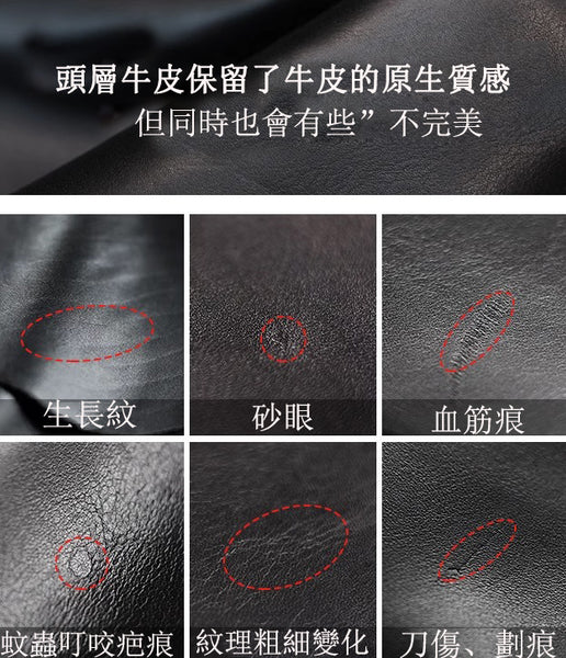 李記所有包包均選自天然頭層牛皮,它保留了頭層牛皮最初的美好柔軟、堅韌、彈性,同時也保留了它的不完美比如血筋、小疤痕紋理這些都是天然且珍貴的印記注意:手工製作過程中留小的細小劃痕和指甲印記,及五金敲打的細微痕迹,無法避免,不屬於品質問題,